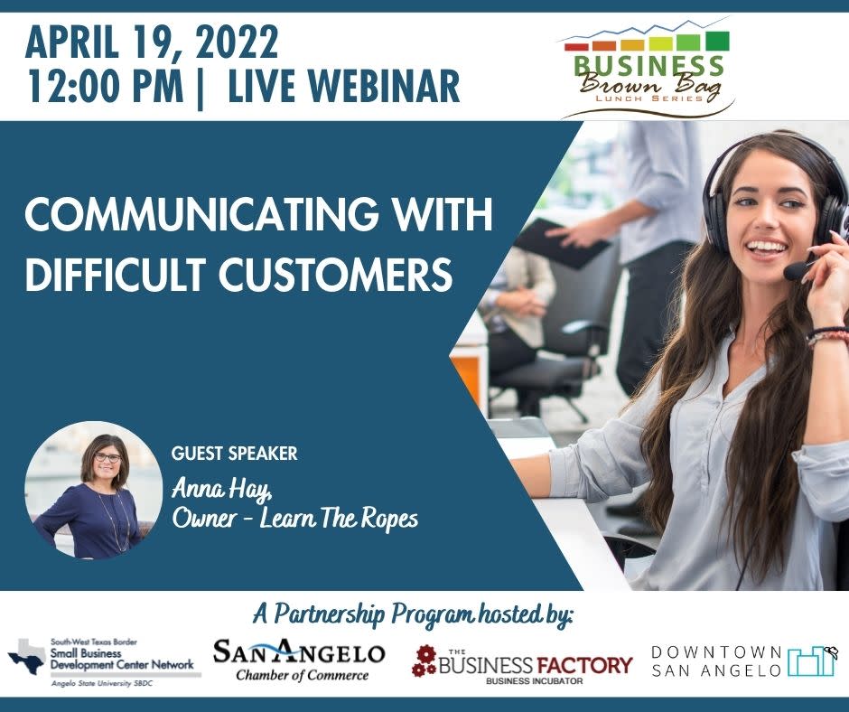This session is geared towards owners, managers, and front-line employees. Customer service can be a difficult task in the climate of COVID - 19. Many of our small businesses are understated and are having to deal with unhappy customers. Turn that frown upside down with Guest Speaker, Anna Hay, owner of Learn the Ropes. She will share with us how to offer excellent customer service, handle difficult situations, and practice active listening on this live webinar. The Business Brown Bag event is co-hosted by the ASU SBDC, the San Angelo Chamber of Commerce, the Business Factory, and Downtown San Angelo Inc.