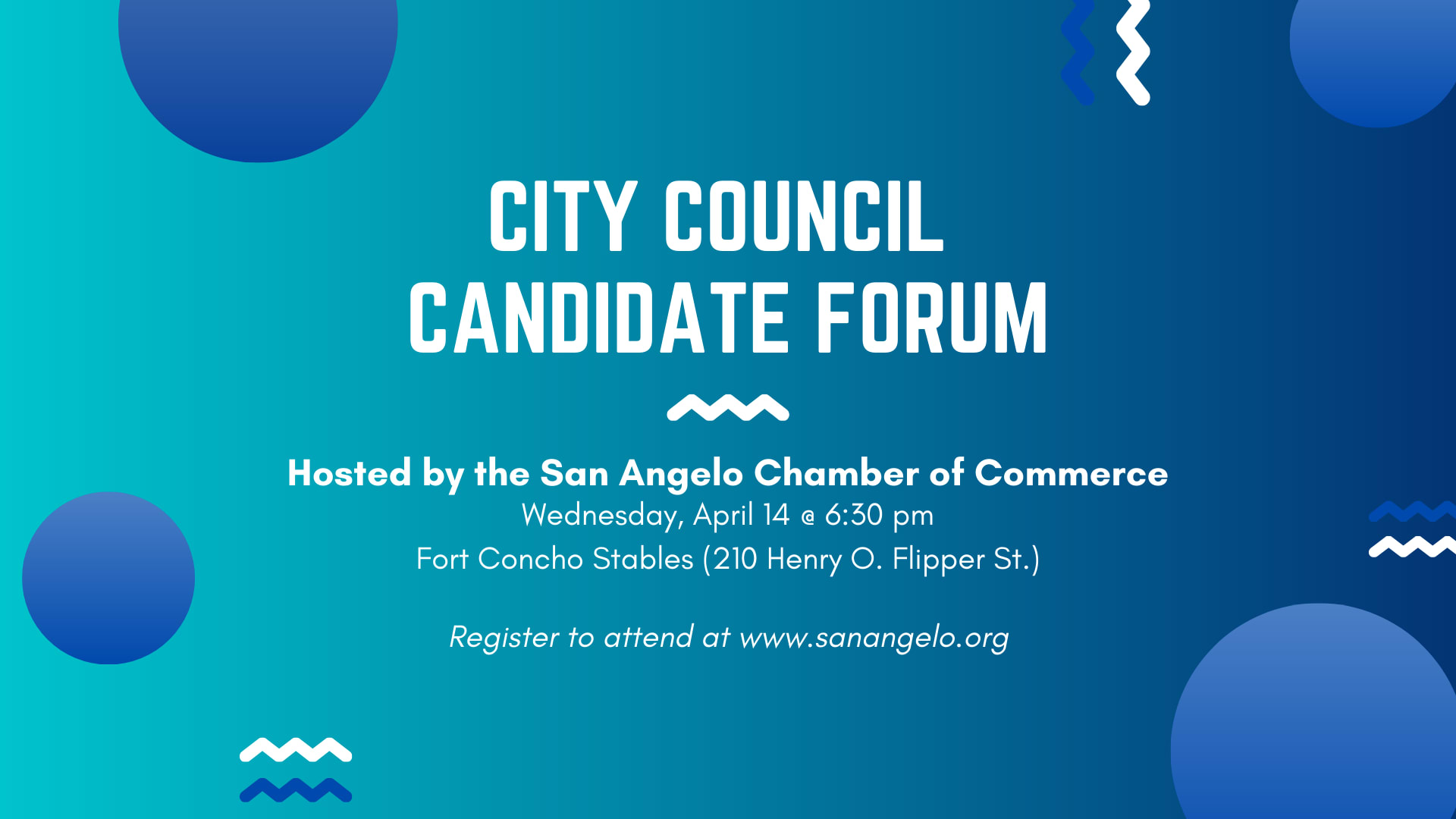 Join us for a City Council Candidate Forum hosted by the San Angelo Chamber of Commerce on Wednesday, April 14 at 6:30 pm at the Fort Concho Stables.