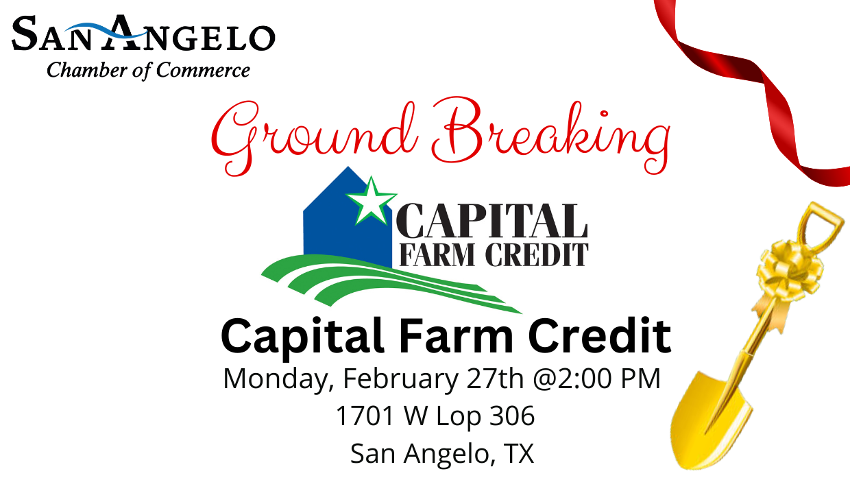 Please join the San Angelo Chamber of Commerce on Monday, February 27th at 2:00 pm to celebrate in a ground breaking ceremony for Capital Farm Credit. For more than 100 years, Capital Farm Credit has supported rural communities and agriculture with reliable, consistent credit and financial services. Capital Farm Credit is a proud member of the Farm Credit System and serves more than 23,000 members, with loans outstanding totaling more than $11 billion. Headquartered in Bryan, Texas, Capital Farm Credit has offices serving 192 of Texas’ 254 counties. They are excited to announce ground breaking on a new location, at 1701 W Loop 306. Refreshments will be served.