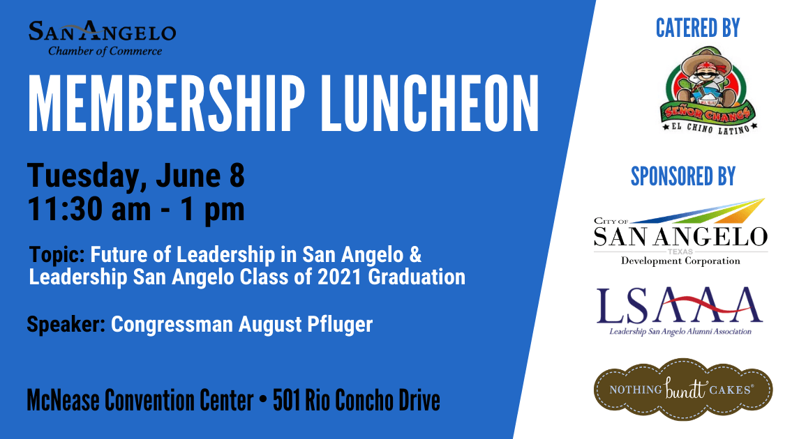 Join us as we celebrate the achievements and recognition of the 2020-2021 Leadership San Angelo graduates. Leadership San Angelo gives participants the opportunity to develop community knowledge and leadership skills through a nine-month hands-on training program. To date, more than 900 participants have graduated from the Leadership program. We are so excited to announce that Congressman August Pfluger will be our special guest speaker for this luncheon. Join us on June 8th at the McNease Convention Center for this special event!