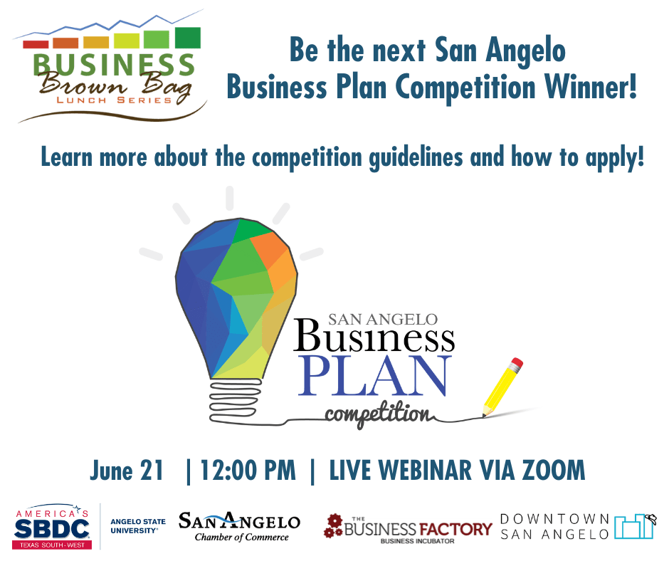 The ASU Small Business Development Center is excited to partner with the San Angelo Chamber of Commerce, Downtown San Angelo, Inc., and the Business Factory to host this no-cost webinar. Join us for a review of the San Angelo Business Plan Competition. This Annual competition is hosted in partnership by the ASU Small Business Development Center, the ASU Norris – Vincent College of Business, and the City of San Angelo Development Corporation. The panel will discuss the competition guidelines, how to apply, the application window, and how the grant funds can be utilized. The presentation will include an overview of the elements of the business plan to help you submit an award-winning application!