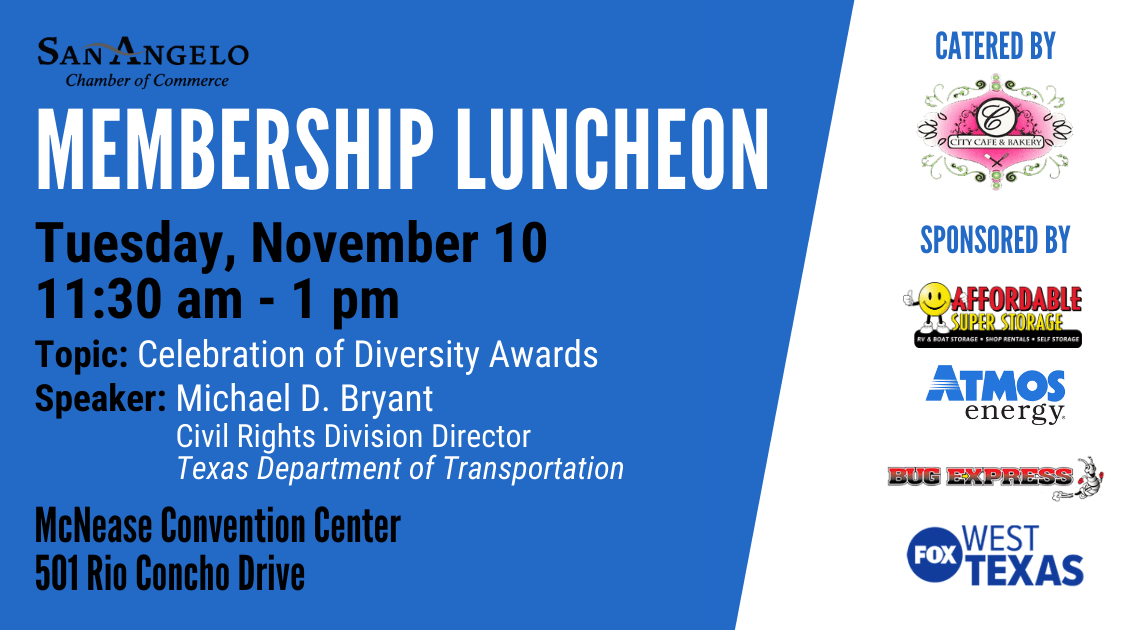 The World Health Organization has declared the novel Coronavirus (COVID-19) a worldwide pandemic. Due to its capacity to transmit from person-to-person through respiratory droplets, the government has set recommendations, guidelines, and some prohibitions which the San Angelo Chamber of Commerce adheres to comply.To reduce congregating, we will not have a registration table set up. Therefore, we will not be accepting payments or walk-ins at the door. Please register in advance and pay all outstanding balances online prior to the luncheon. If you did not pay at the time of registration the link to complete your payment is in your confirmation registration email.Please see below for the preventative measures we are taking to reduce the spread of COVID-19:
