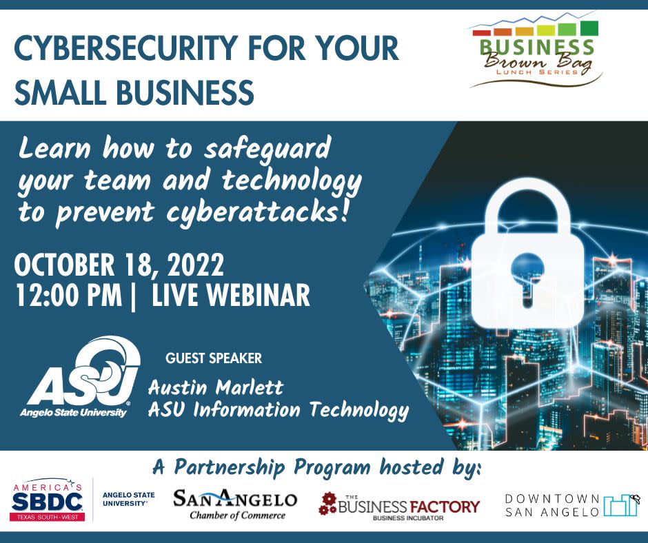 Title: Business Brown Bag: Cybersecurity for Your Small Business Start Date: 10/18/2022 Scheduled Time(s): 12:00 PM - 1:00 PM Description: The ASU Small Business Development Center is excited to partner with the San Angelo Chamber of Commerce, Downtown San Angelo, Inc., and the Business Factory to host this no-cost webinar. Cyber attacks happen more and more to small businesses because they are more vulnerable. Phishing emails and targeted attacks are easier to spot if you understand what to look for. At this event hear from the Angelo State University Information Technology Security Team to find out how to safeguard your team and technology to prevent attacks and learn what to do if you are ever put into that situation. Speaker: Austin Marlett, ASU Information Technology Signup URL : angelo-edu.zoom.us/webinar/register/WN_zX5-0aj0To6rQSIUi_cWxQ