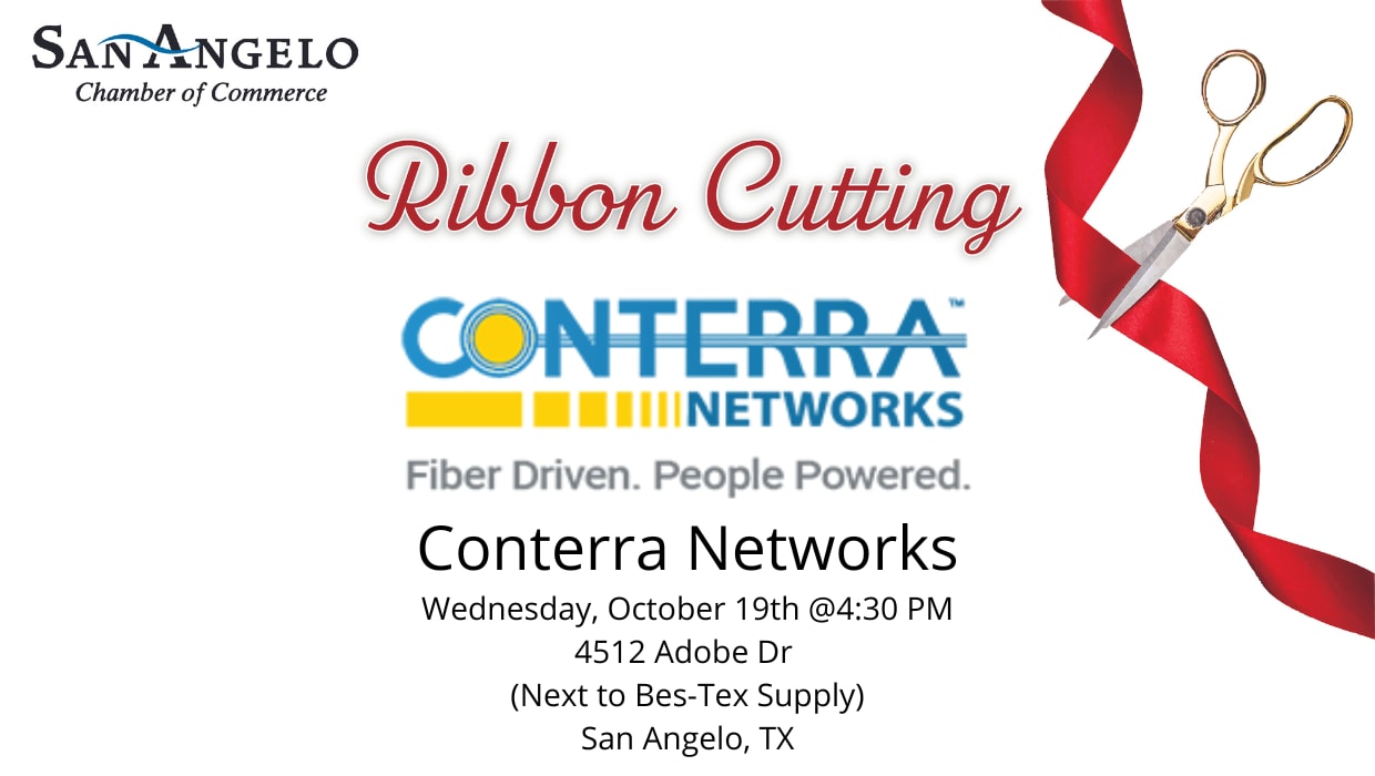 Please join the San Angelo Chamber of Commerce on Wednesday, October 19th at 4:30 PM to help celebrate with Conterra Networks. Conterra is expanding their footprint into new areas of the San Angelo market by offering 100% fiber high-speed internet, phone, and transport services. They offer these services in the San Angelo and Brownwood areas. With service speeds starting at 200 M to 10G, their all-fiber network is designed, built, and managed by their team of local experts for 99.999% reliability and uptime. Conterra is passionate about creating custom solutions built for your business and speak directly to customers for a personal experience – just like their service provides. Refreshments and possible give aways will be provided. Ribbon cutting will be at San Angelo Studios located at 12 E Twohig.