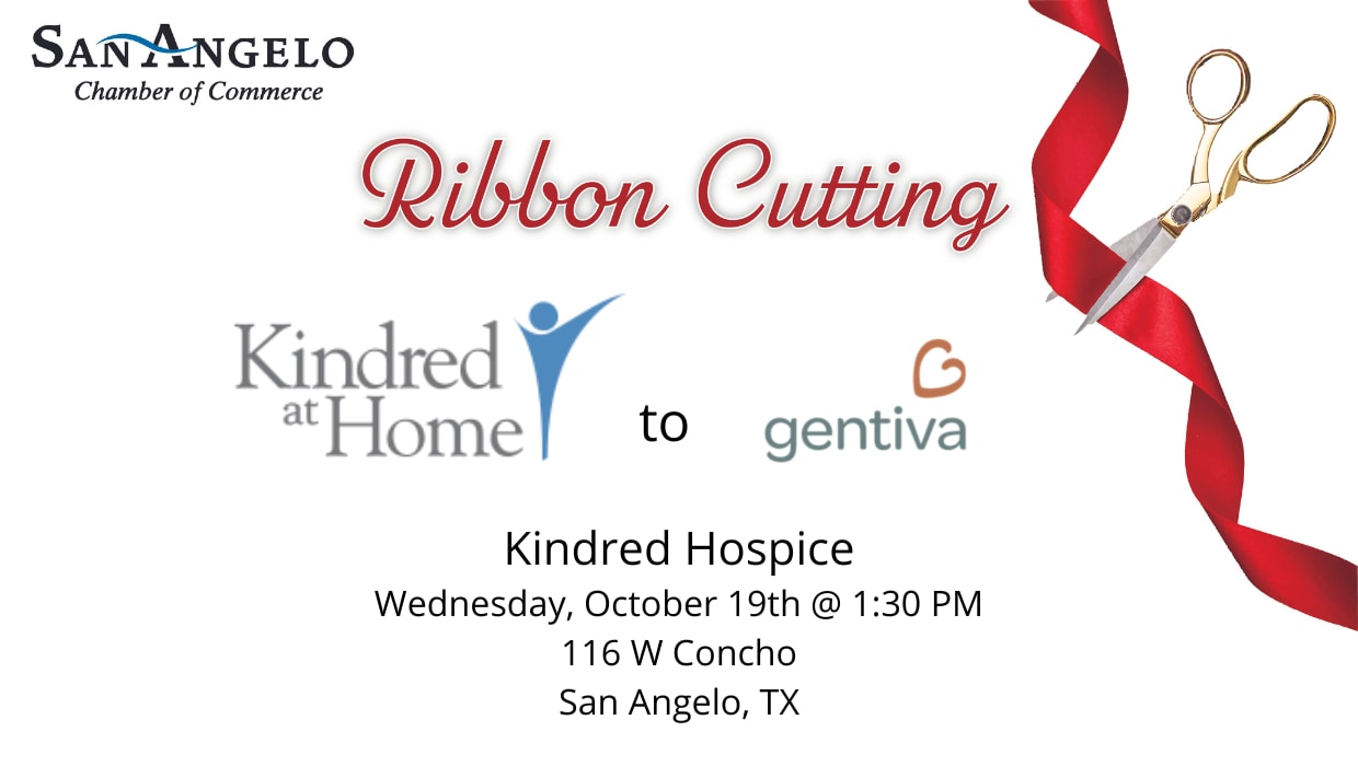 Join the San Angelo Chamber of Commerce on Wednesday, October 19th at 1:30 pm to celebrate an official name change from “Kindred Hospice” to “Gentiva Hospice.” Kindred is one of the longest-running hospice agencies in San Angelo and will be changing names from Kindred Hospice to Gentiva Hospice on October 19th. Gentiva Health was an older name of the company, and they are returning back to that name. This ribbon cutting will announce the name change to the public. This ribbon cutting will take place at 116 W Concho, next to the SAAF.