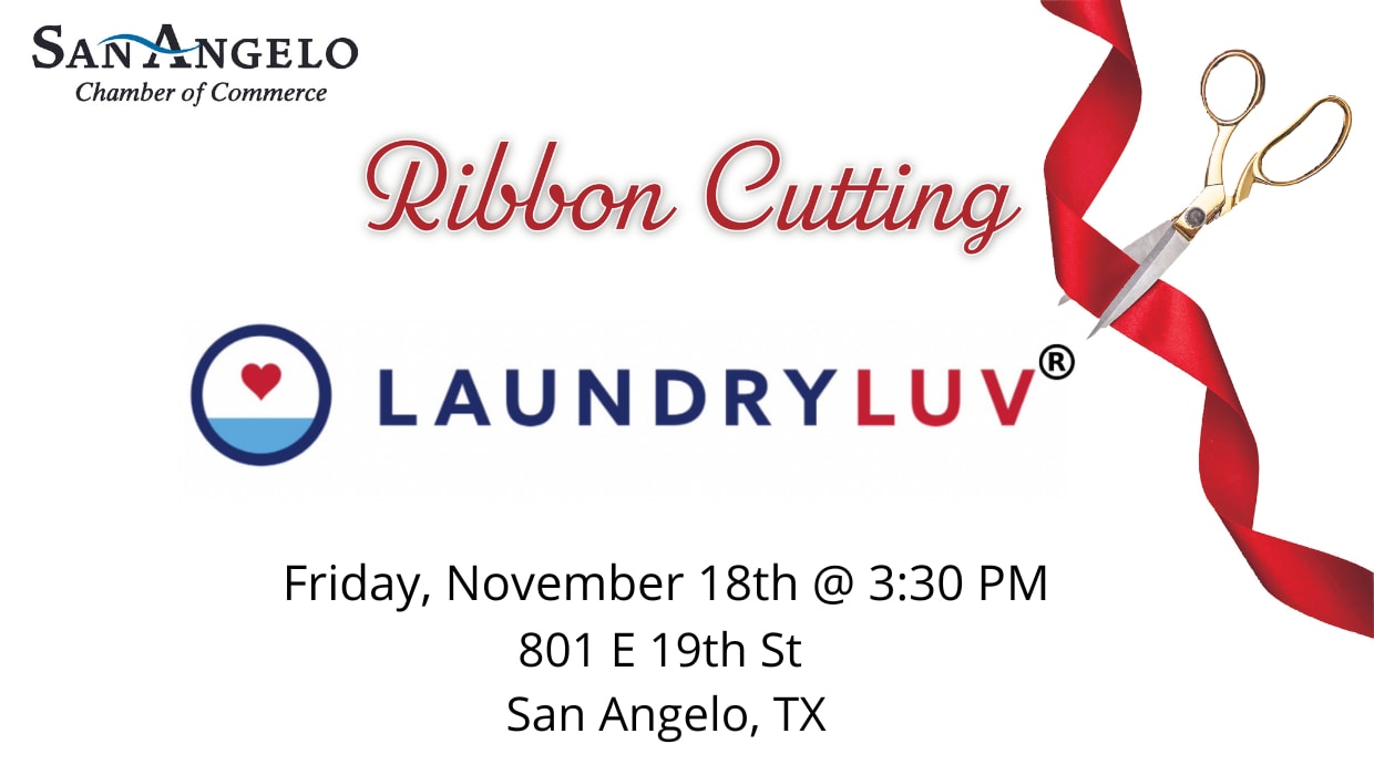 Please join the San Angelo Chamber of Commerce on Friday, November 18th @ 3:30PM to help celebrate the grand opening of Laundry Luv’s second location in San Angelo. Laundry Luv is opening their second location in San Angelo at 801 E 19th Street! Laundry Luv strives to create the premier family-friendly laundry experience with state-of-the-art equipment and technology. Their goal is to create a bright, friendly, enjoyable, and clean environment for you and your family to wash your clothes. We are excited to celebrate with them, the opening of their second location to serve more of the San Angelo community! Refreshments will be provided.