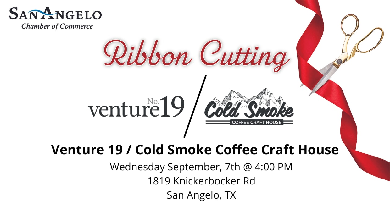 Join the San Angelo Chamber of Commerce on Wednesday, September 7th at 4:00PM to celebrate the grand opening of TWO new businesses! These businesses are sister companies opening in the building formerly known as Korona’s formal wear and are located right next door to each other. Venture19 is the place for your home, gift, and apparel needs. With gourmet foods, kid’s toys, men’s apparel, home décor, and boutique items fit for everyone’s closet, you’re sure to find what you want at venture19. Cold Smoke Coffee Craft House cures what ails you. Filled with coffee and other craft concoctions, Cold Smoke is your new favorite place to be. With the perfect combination of warmness and a friendly environment, Cold Smoke is the perfect place for a study spot or your next date.