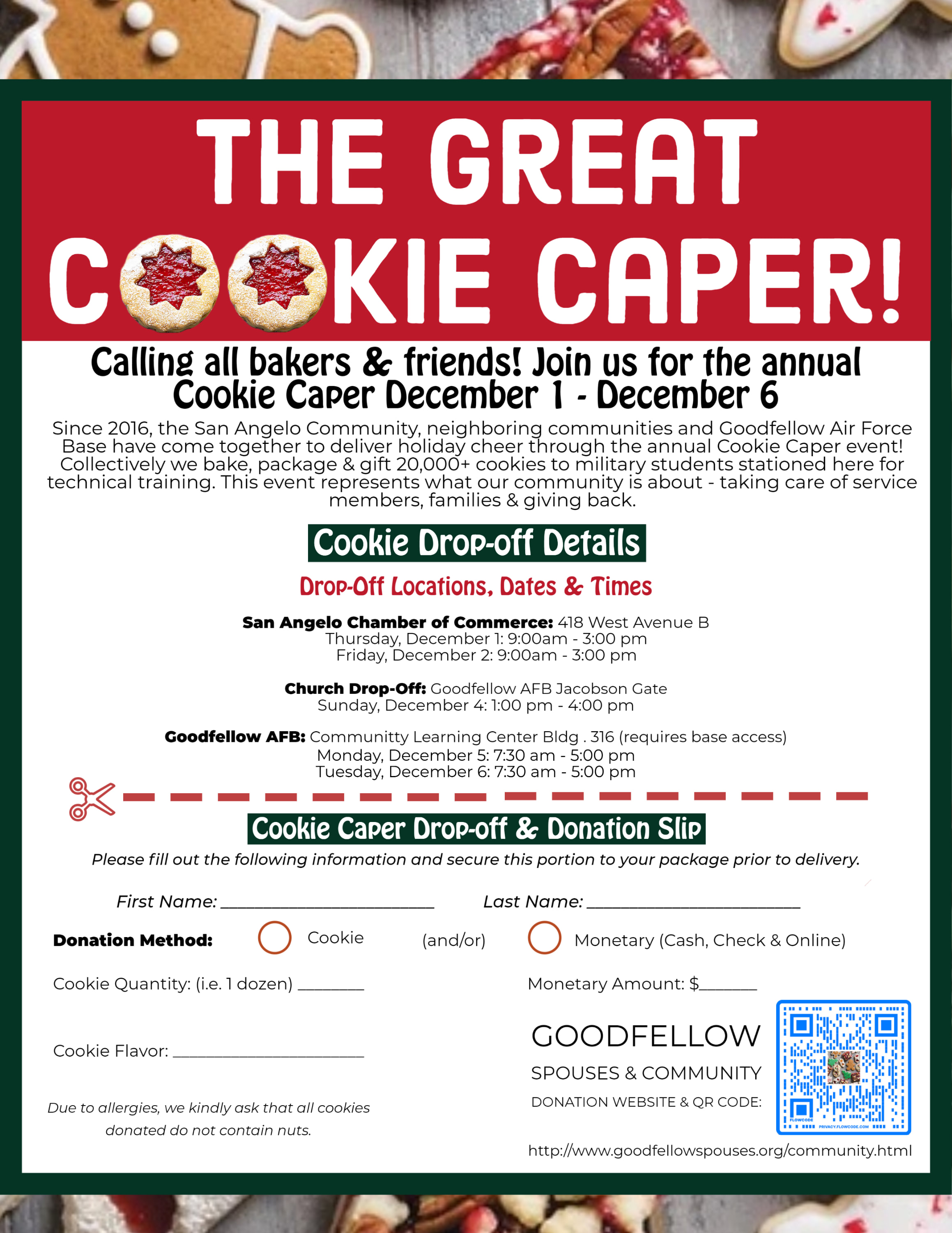 Calling all bakers & friends! Join us for the annual Cookie Caper December 1 - December 6! Since 2016, the San Angelo Community, neighboring communities and Goodfellow Air Force Base have come together to deliver holiday cheer through the annual Cookie Caper event! Collectively we bake, package & gift 20,000+ cookies to military students stationed here for technical training. This event represents what our community is about - taking care of service members, families & giving back.