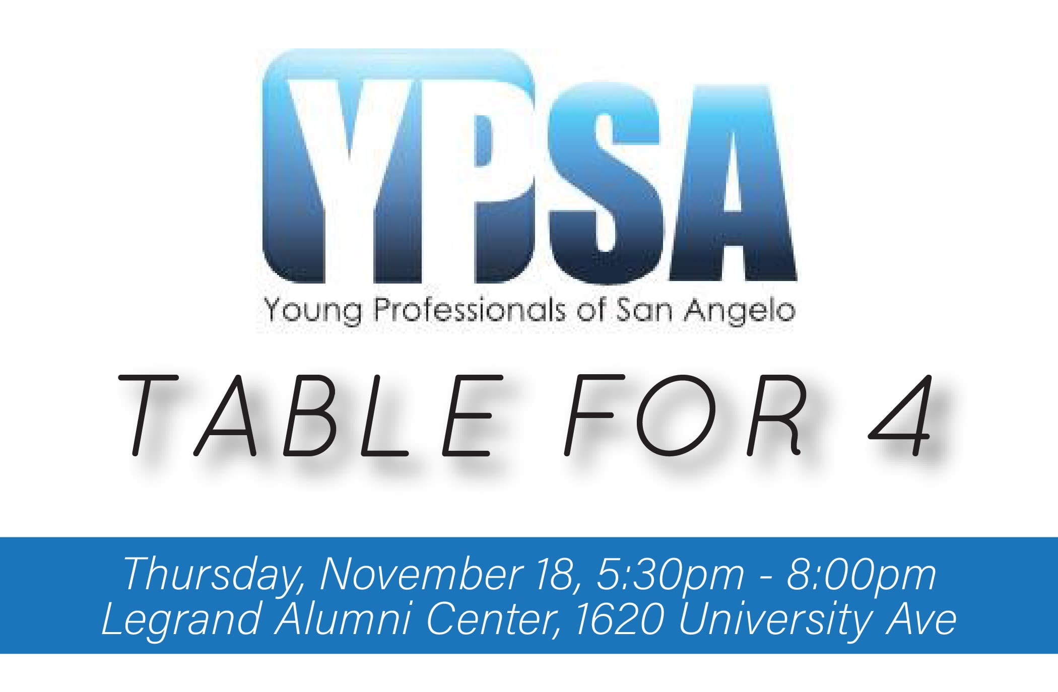 YPSA's premier networking event, Table for 4 will be held November 18, 2021 at the LeGrand Alumni Center. Members remark that this event is similar to speed dating, but with the purpose of business card exchanges. It is often cited as members' favorite event. For each course of a four course meal, attendees switch between theme tables to mix and mingle with new groups of local young professionals. Table for 4 is a member exclusive event. If you are interested in attending, join YPSA today!